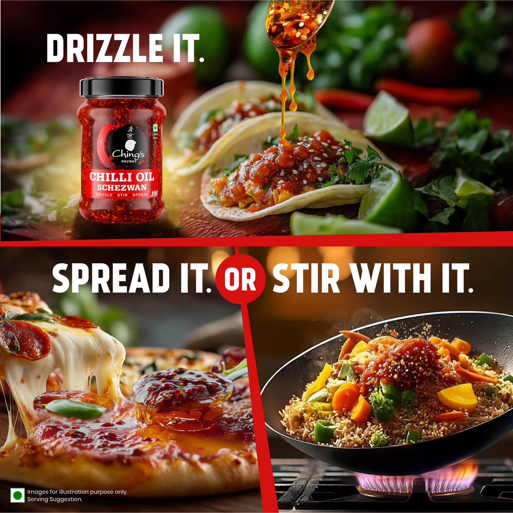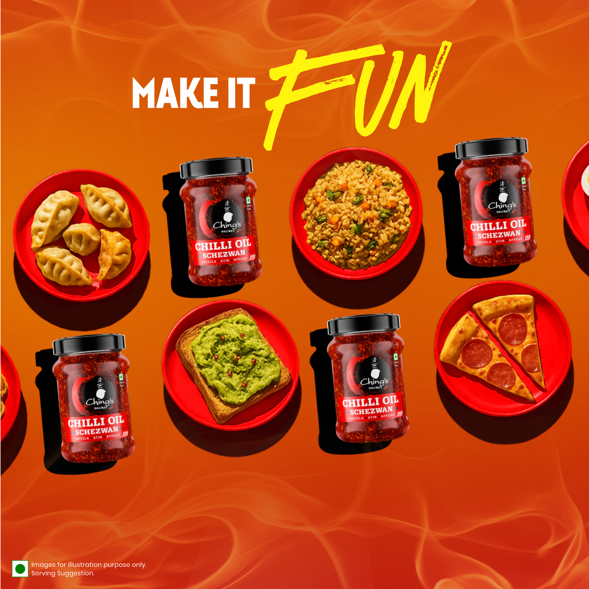 STIR. SPREAD. DIP. COOK. DRIZZLE: This is your secret weapon to turn ordinary dishes into unexpected flavourful surprises. New Ching’s Chilli Oil Schezwan. DRIZZLE it on Eggs, Pizza, Soups, Korean BBQ and even Dal. STIR it into Noodles, Fried Rice, Stir-fries, Pasta, Salad Dressings and Dips. SPREAD it on wraps, rolls and sandwiches. And don’t forget to dunk and dip Momos, Dimsums, Bhajiya or Fries, into it for a satisfying explosion of heat and flavour in your mouth!