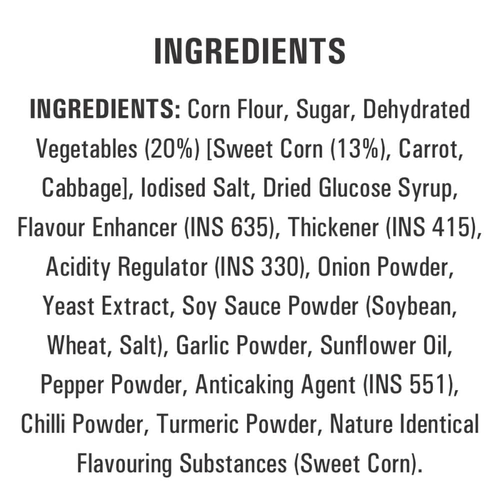 - Ching's Sweet Corn Veg Soup has Shelf Life of 12 Months from the date of Manufacturing.
