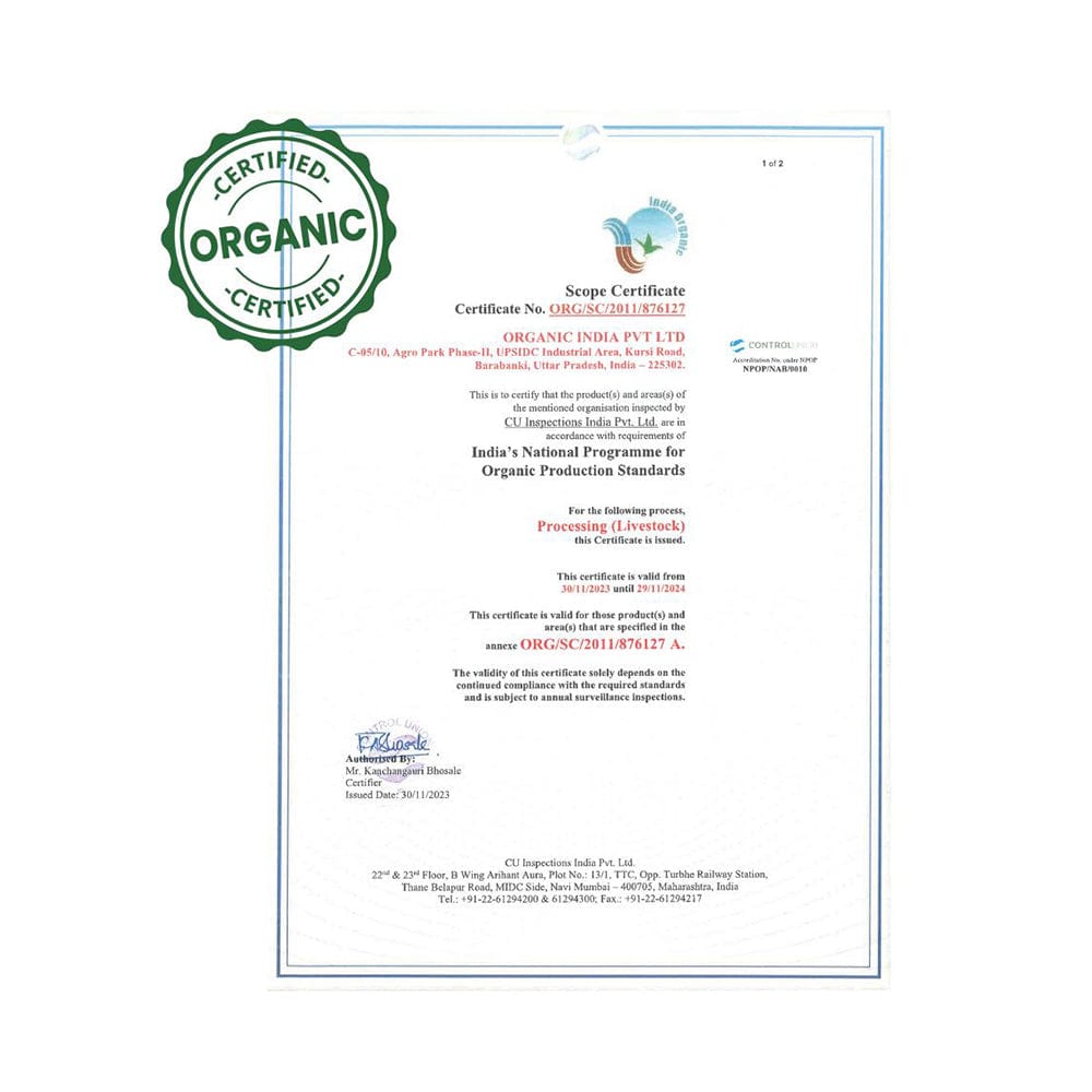 - CONSCIOUS IN ACTION: We partner with small family farmers across India to cultivate sustainable organic farmland. Each ORGANIC INDIA product connects Mother Nature, our farmers, and you.